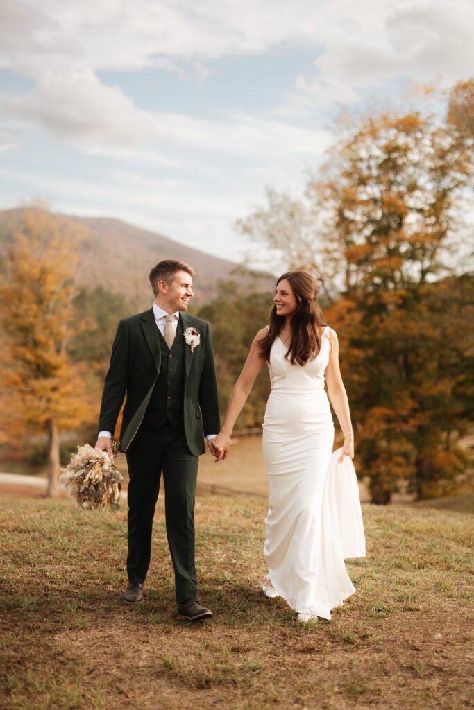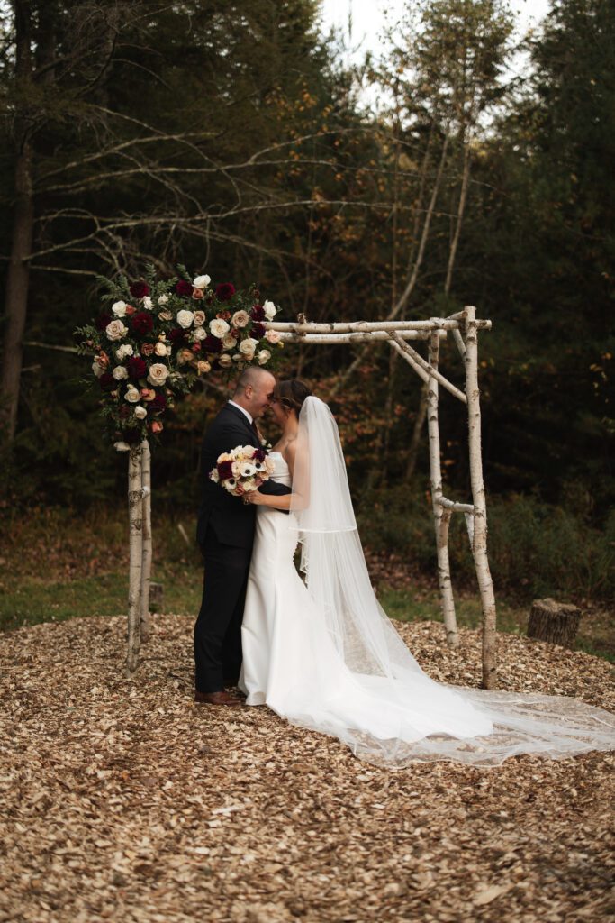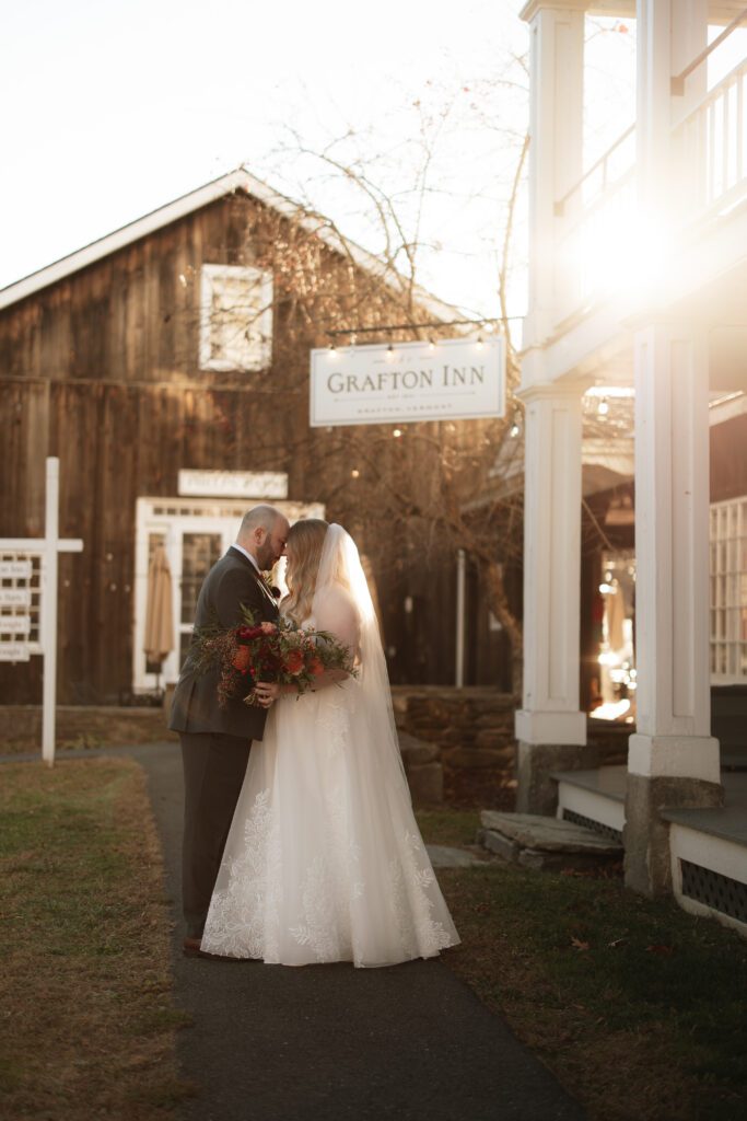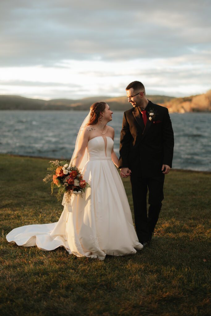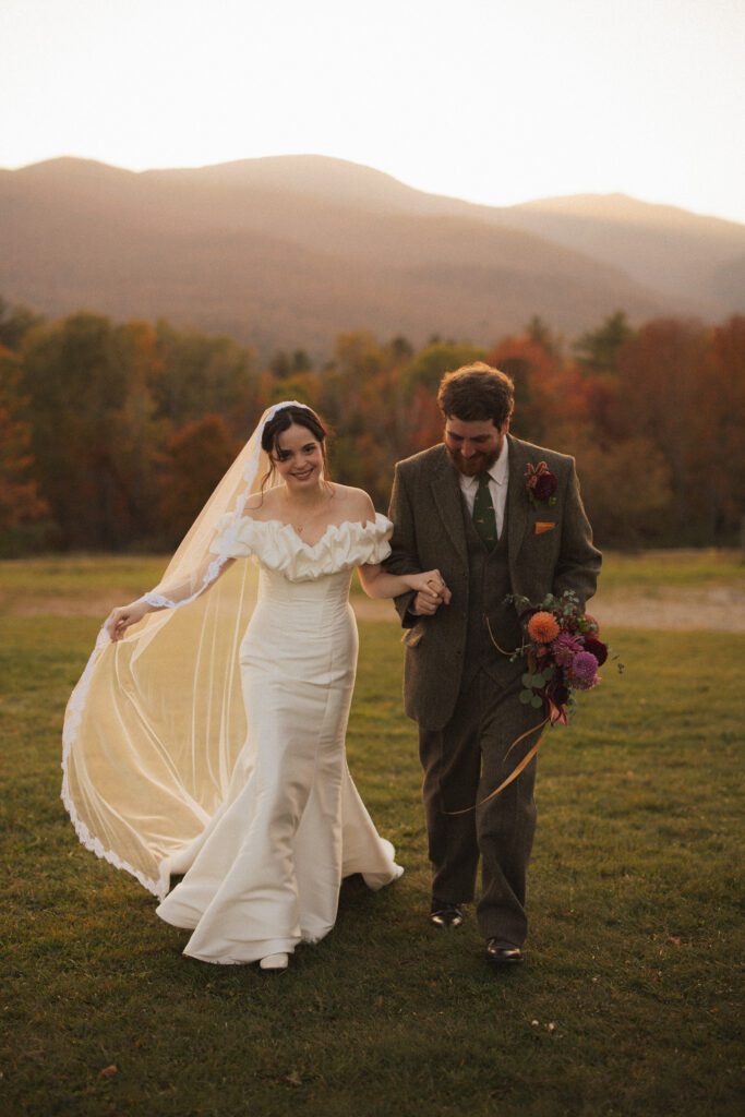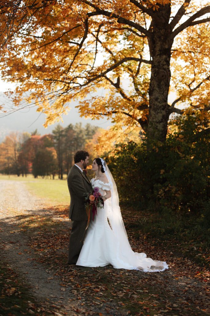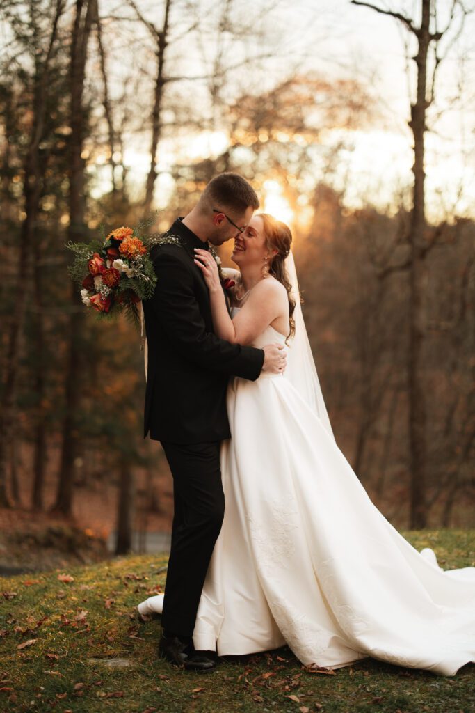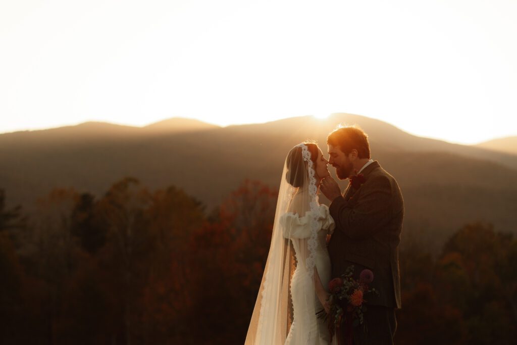 Bride and groom sharing a sunset moment at a mountain wedding venue in Vermont with fall foliage and scenic views